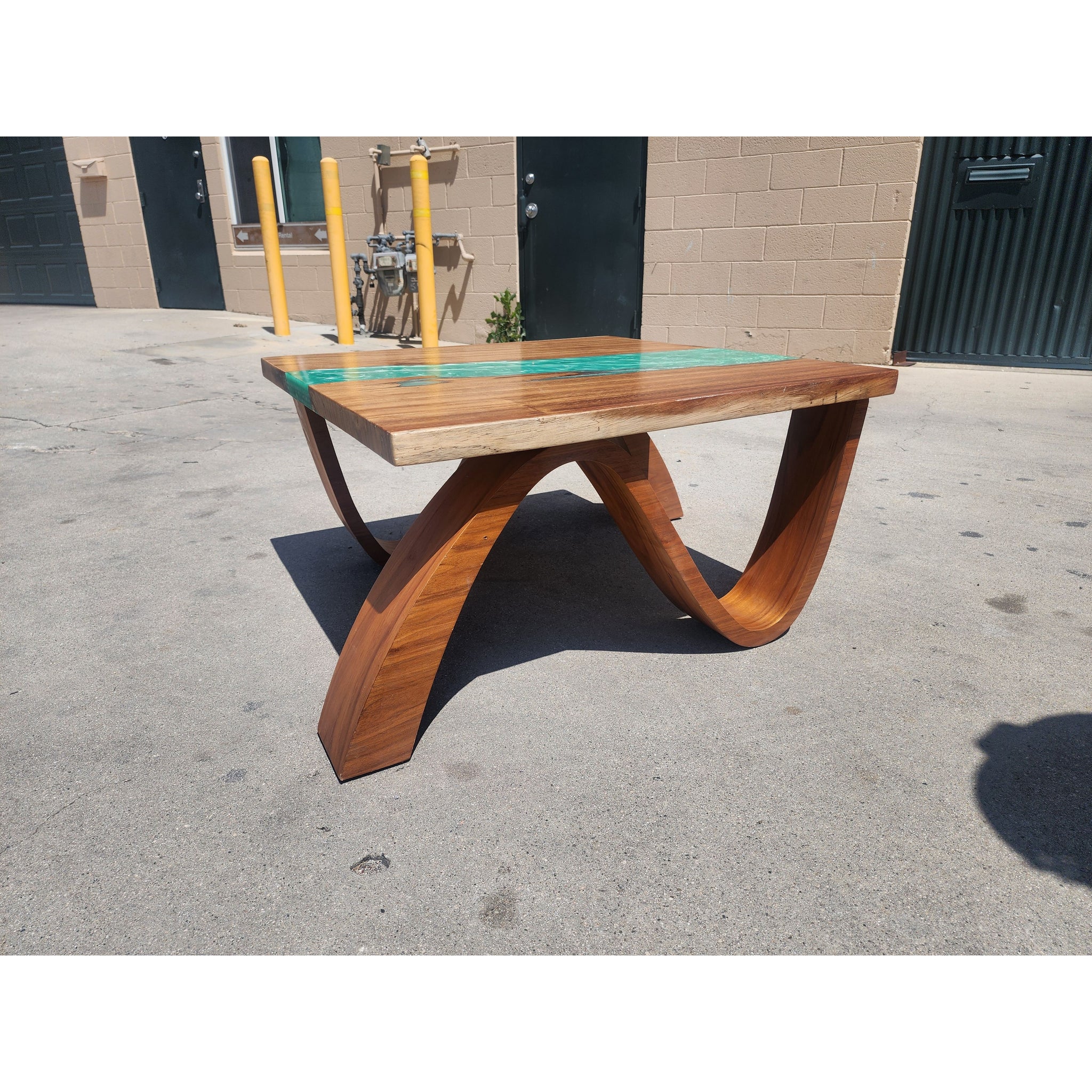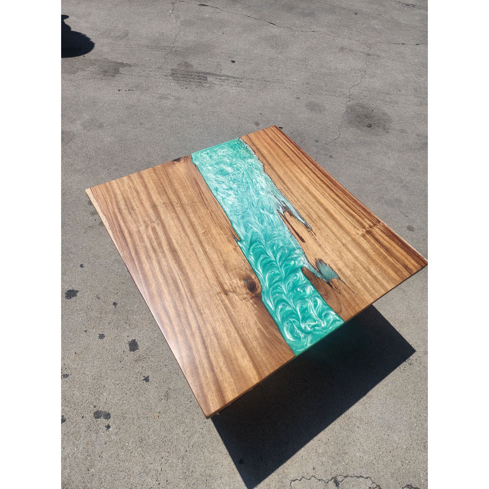 Handcrafted with monkeypod wood and designed with a teal resin river throughout. Custom wood legs which can be placed in a variety of directions and styles.