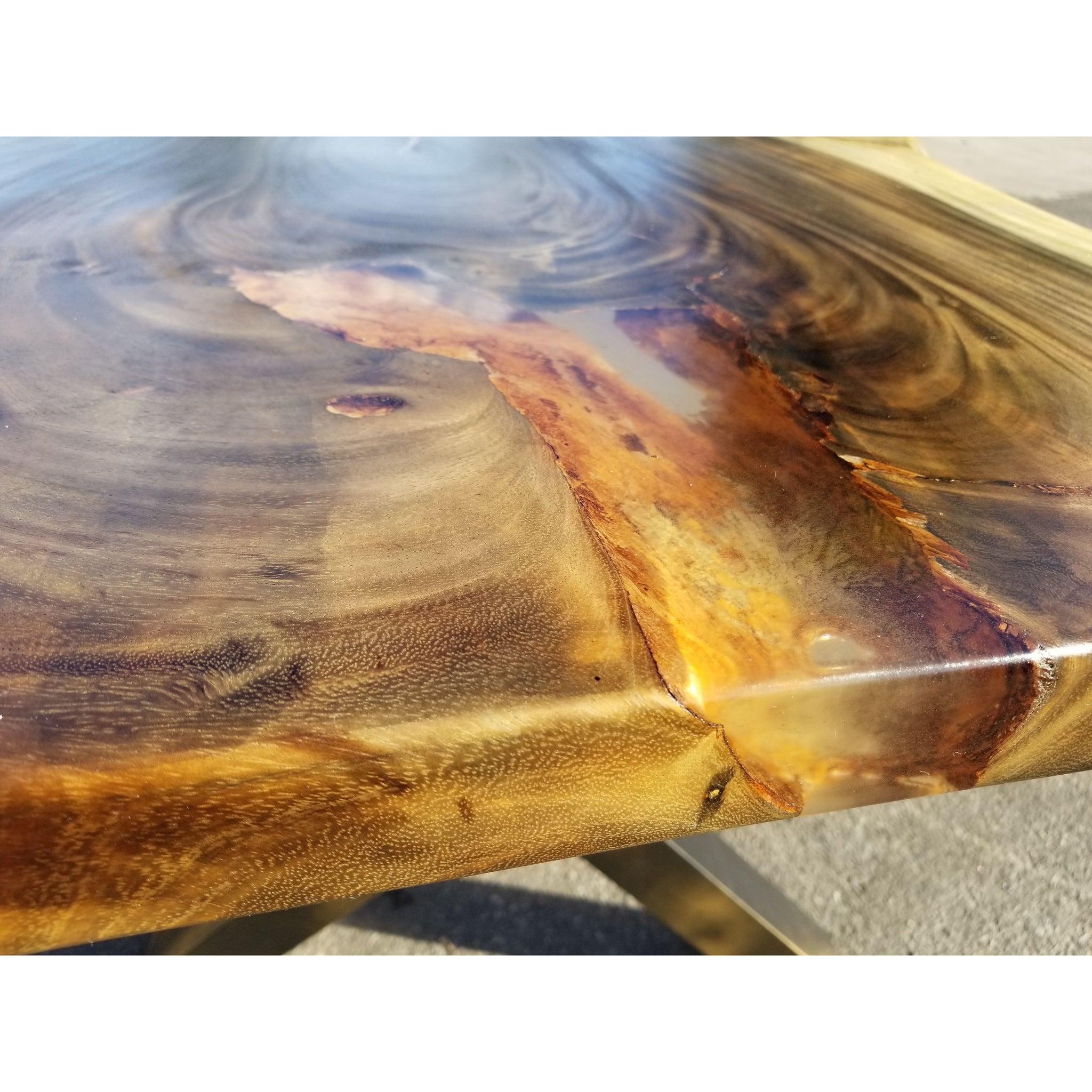 Bring the Grandeur and Artistry of this Beautifully Stained, Solid Slab right into your home or office. Gorgeous color dimension and clear resin features give life to this Live Edge, Acacia wood table.