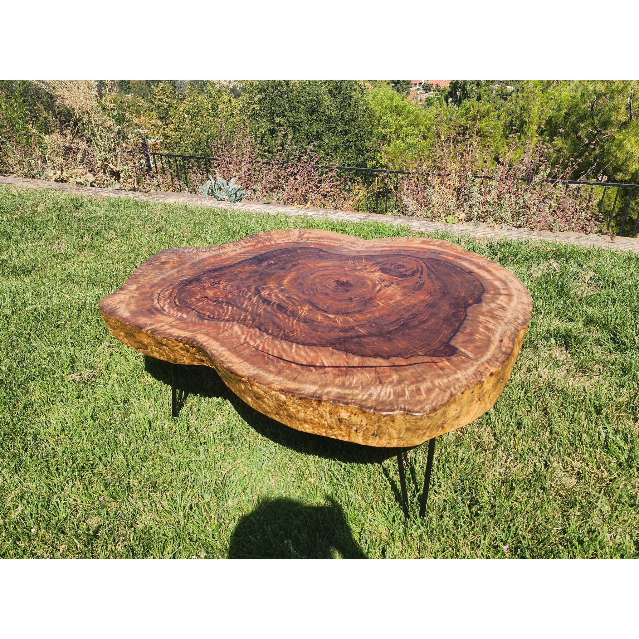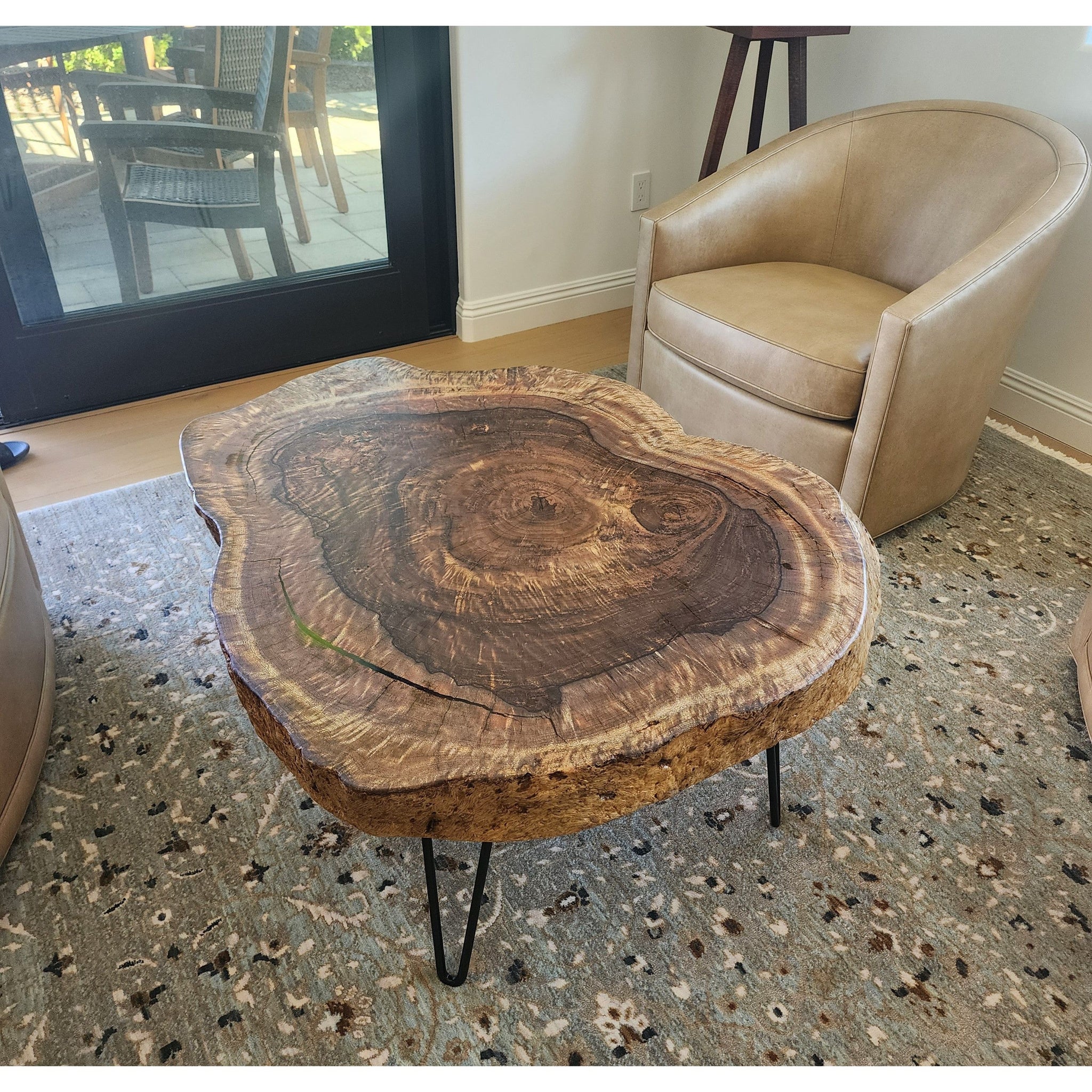 Gorgeous light and mid-tone browns give character and life to this thick, round Mango wood slab. Legs are hairpin style and can be changed out upon request.