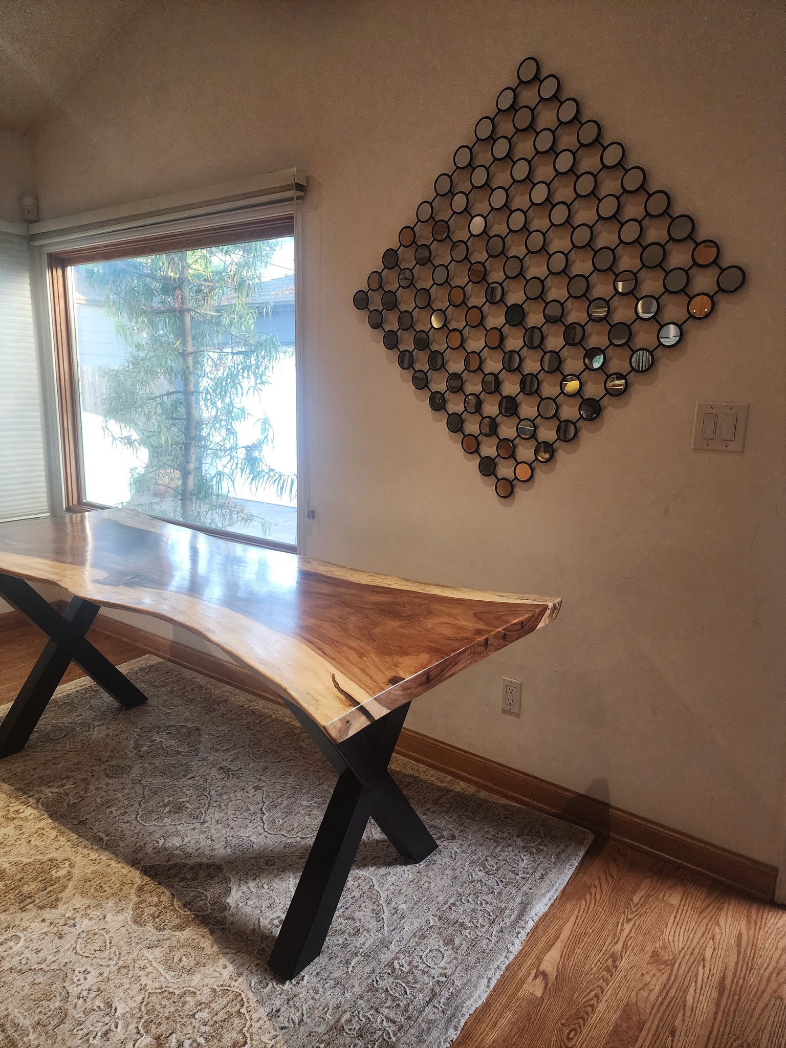 This live edge, 100% Acacia wood dining table is hand crafted with amazing artistry. The featured table is 96”L x 35-39”W x 2.5” thick. This particular solid slab table has been finished with all cracks and crevices filled in with a clear resin.